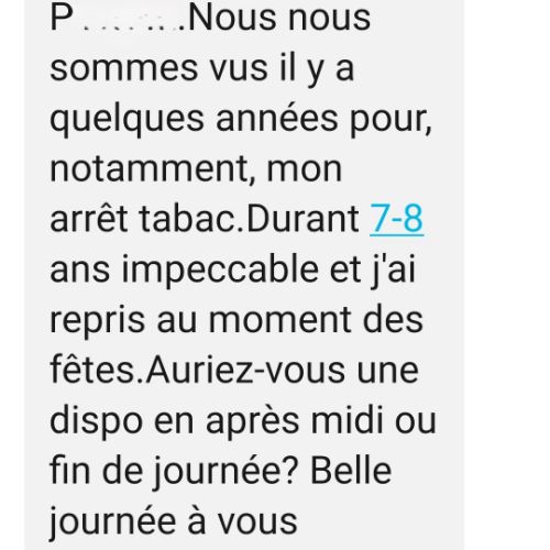 Attention: En ce qui concerne le Tabac, prévoyez 2 séances espacées d'une semaine (paiement des 2 séances à la première)